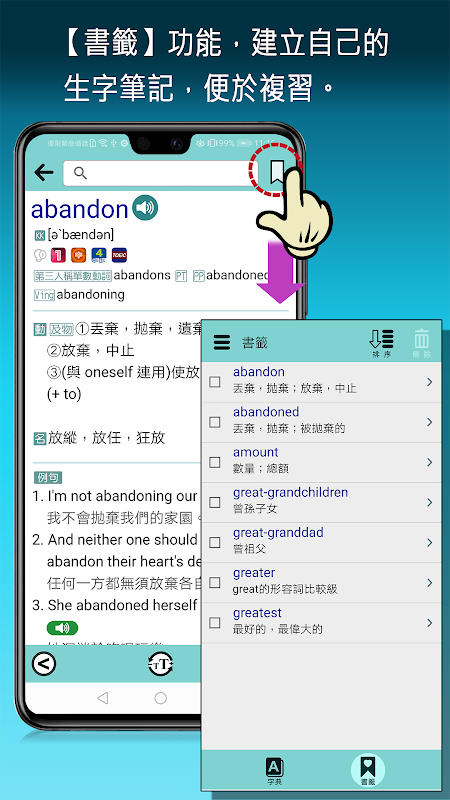 "Me Practical English-Chinese Dictionary" علائم آوایی ، بخشهایی از گفتار ، معنی کلمه را ارائه می دهد و دارای عملکرد تلفظ است. همچنین تغییرات متناوب افعال مشترک ، تغییرات جمع اسامی ، تغییرات مقایسه ای و فوق العاده صفتها / قیدها را فراهم می کند ، بنابراین می توانید نه تنها استفاده صحیح از تک شخصیت ها را یاد بگیرید ، و تلفظ را تمرین کنید. همچنین می توانید واژگانی را که آموخته اید یا واژگانی را که فکر می کنید دشوار است برای تسهیل بررسی در آینده به نشانک های خود اضافه کنید.