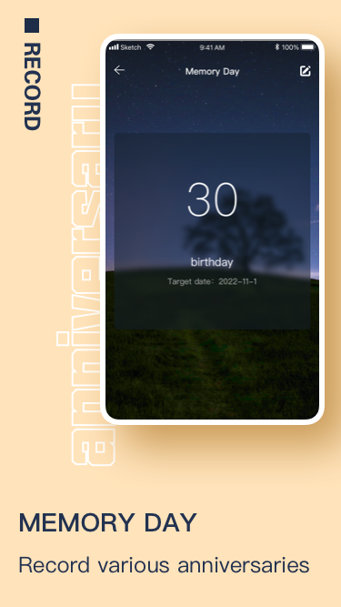 برنامه Memorialday یک برنامه مدیریت برنامه است که می تواند تاریخ های مهمی مانند سالگرد عشق و تولد را ثبت کند. کاربران می توانند انواع روزهای مختلف مانند تولد، سالگرد، زندگی، کار یا سفارشی را در برنامه یادبود اضافه و مدیریت کنند و زمان یادآوری سفارشی را تنظیم کنند تا روز مهم را از دست ندهید.