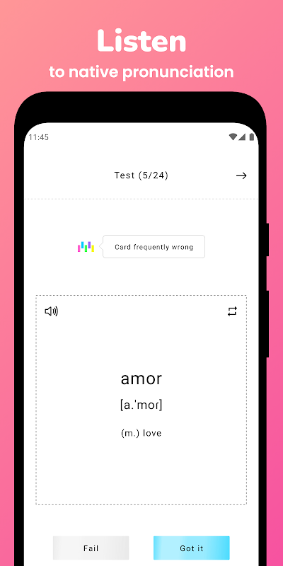 -از شروع با تعداد کمی فلش کارت ، تعداد بیشتری از موارد به طور خودکار به مجموعه تست بعدی اضافه می شود تا زمانی که بتوانید همه کارت های موجود در فرهنگ لغت را حفظ کنید.