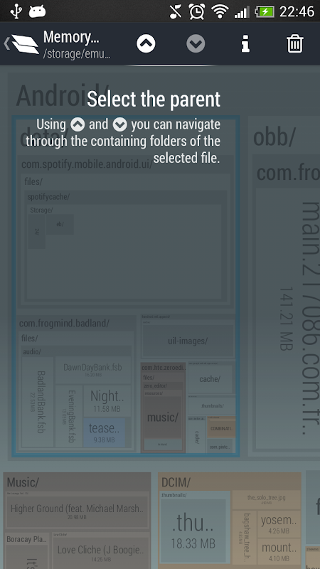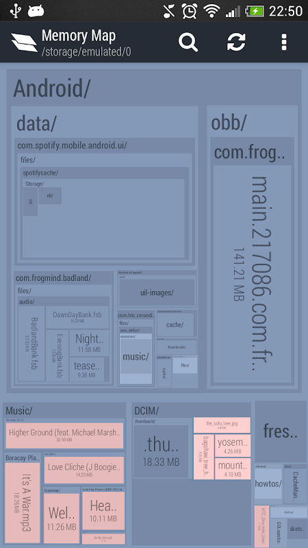Memory Map is NOT another cache cleaner. It focuses on bringing you an overall view of your disk and allows you to delete your *own* files (pictures, videos, musics...) as well as cache files. To do that, Memory Map is based on a interactive map of all the files and folders contained in your disk. The bigger a file is on the screen, the bigger it is on the disk, it's that simple!