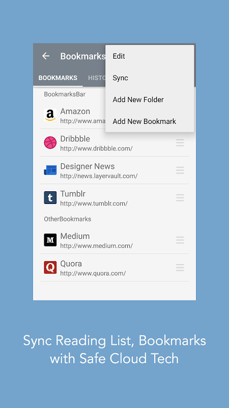 ★ Sync Bookmarks - The bookmarks can be synced between Android & iOS as well as to Chrome & Firefox on desktop, import & export are also supported.