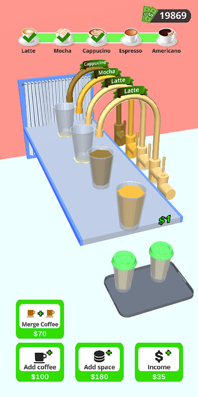 کافی شاپ خود را با دستگاه های قهوه ساز جدید بهبود بخشید. قهوه های لاته، موکا، آمریکایی، اسپرسو و سایر قهوه ها را پر کنید، به مشتریان بفروشید. روی دستگاه ها کلیک کنید و سرعت پر کردن قهوه را افزایش دهید!