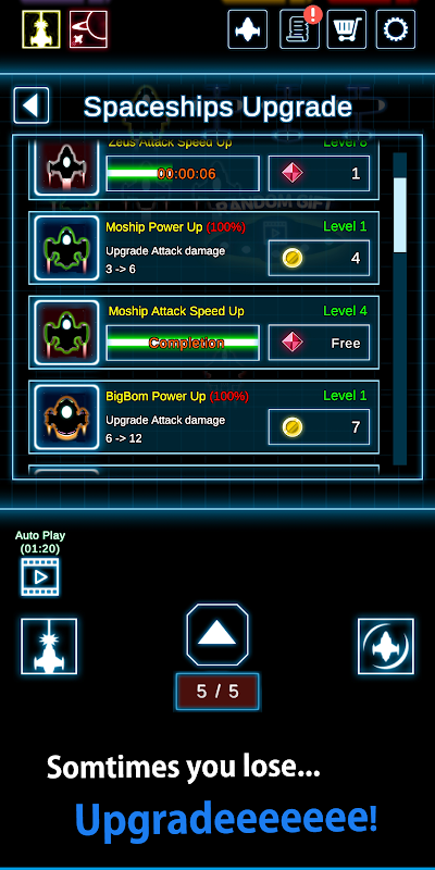 - سفینه های فضایی را برای تکامل انتخاب کنید و یک مورد قدرتمندتر کسب کنید.