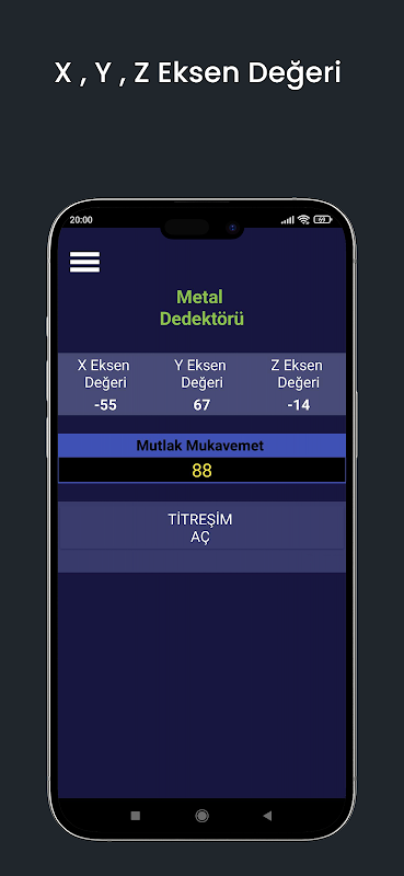 این برنامه ای است که می تواند به عنوان یک فلزیاب، ردیاب طلا، آشکارساز میدان مغناطیسی استفاده شود. با ویژگی لرزش، ارتعاش با توجه به سطح سیگنال افزایش می یابد. مقادیر سیگنال X، Y، Z را نشان می دهد.