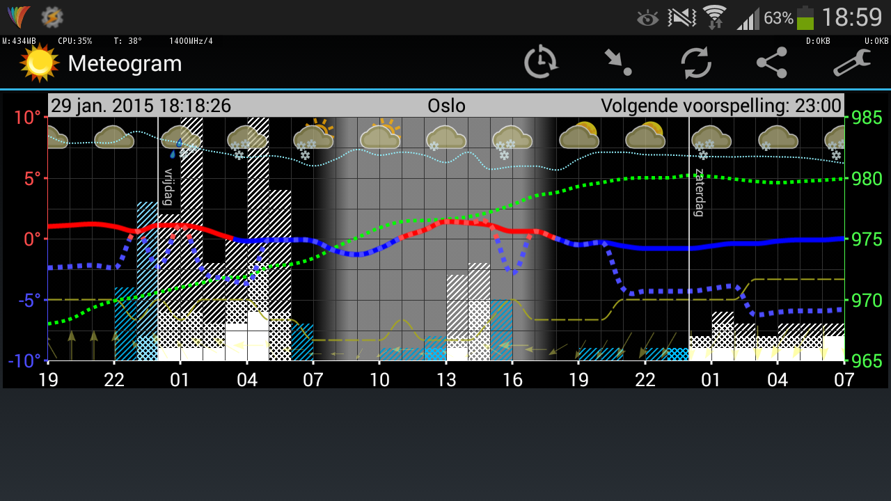 The weather prediction graph can be shown in the main application or in home screen widgets. Multiple widgets for different locations and settings can be shown simultaneously.