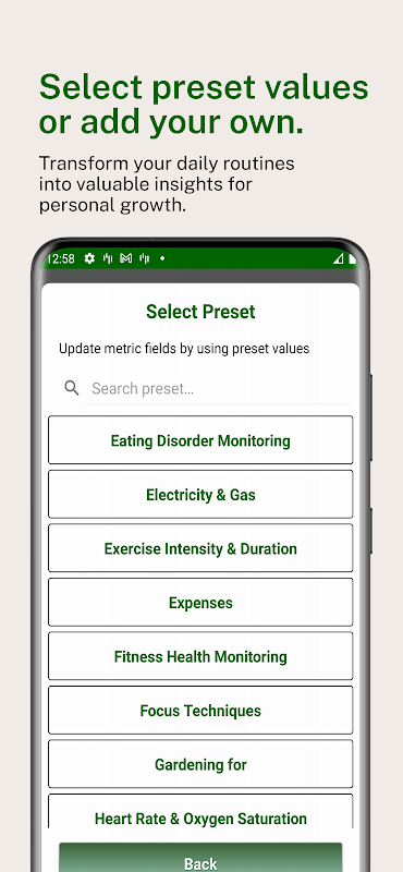 برنامه ما مجموعه بزرگی از پیش تنظیم های متریک را ارائه می دهد که می تواند به شما در ایجاد و ردیابی سریع معیارهای مربوط به حالت، باغبانی، کار، سلامت، فعالیت ها و موارد دیگر کمک کند.