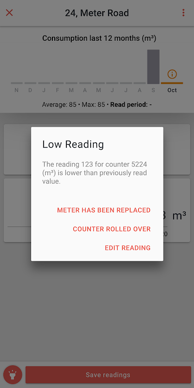 مصرف قبلی کنتور هنگام خواندن در نمودار نشان داده شده است، بنابراین به راحتی می توان صحت قرائت را تأیید کرد. این برنامه هشداری را برای خوانش های نادرست نشان می دهد و اقداماتی را برای اصلاح آن پیشنهاد می کند.