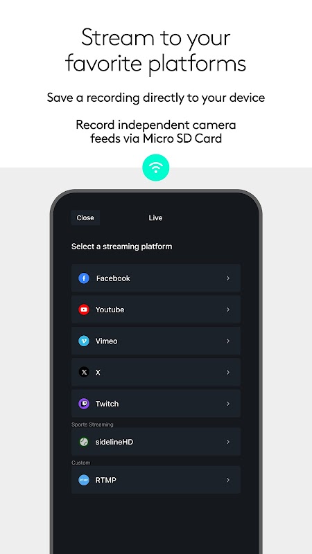 فوراً، با چند ضربه، به پلتفرمهای محبوب مانند یوتیوب، توییتر، توییچ و موارد دیگر پخش کنید. برای پخش چندگانه در Mevo Pro مشترک شوید.*