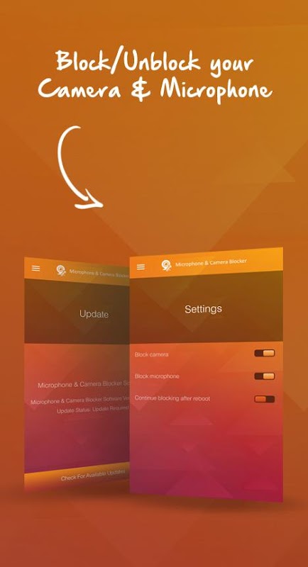 The user can access the app’s settings menu and selectively block either the microphone, the camera, or both at the same time. An aesthetic and user-friendly interface will indicate if the Microphone & Camera Blocker is active or not. If so chosen, the application will continue to be active even after system restart and/or reboot.