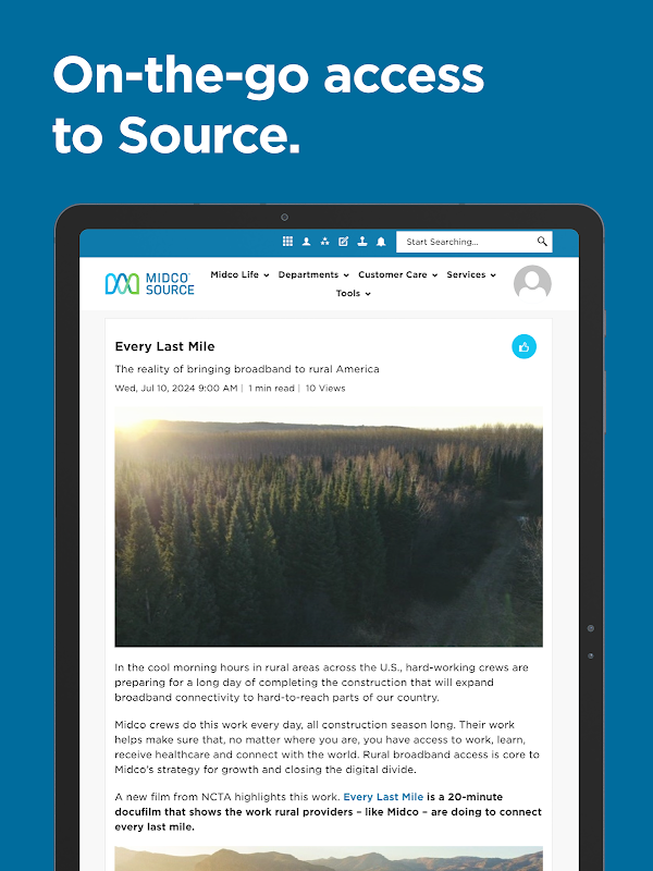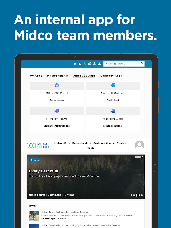 برنامه تلفن همراه سورس Midco به اعضای تیم ما این امکان را میدهد تا در هر جایی که کار به آنها نیاز دارد متصل بمانند. منبع همه را با داستانها، دانش و برنامههایی که برای موفقیت نیاز دارند، بدون توجه به جایی که کار میکنند، مرتبط میکند.