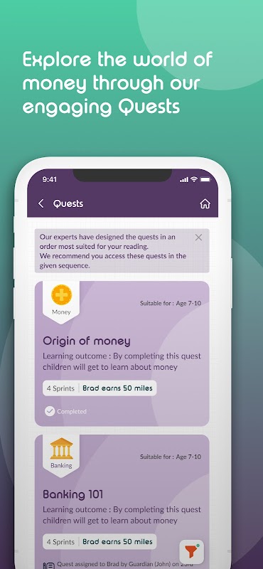 بیاموزید: کودکان می توانند از طریق ماژول های محتوای کوتاه و تعاملی که برای کمک به درک پیچیدگی های مدیریت پول طراحی شده اند، تلاش های یادگیری هیجان انگیز را آغاز کنند. با تکمیل آزمون ها و چالش ها، آنها می توانند مایل ها کسب کنند و پیشرفت خود را در طول مسیر پیگیری کنند.