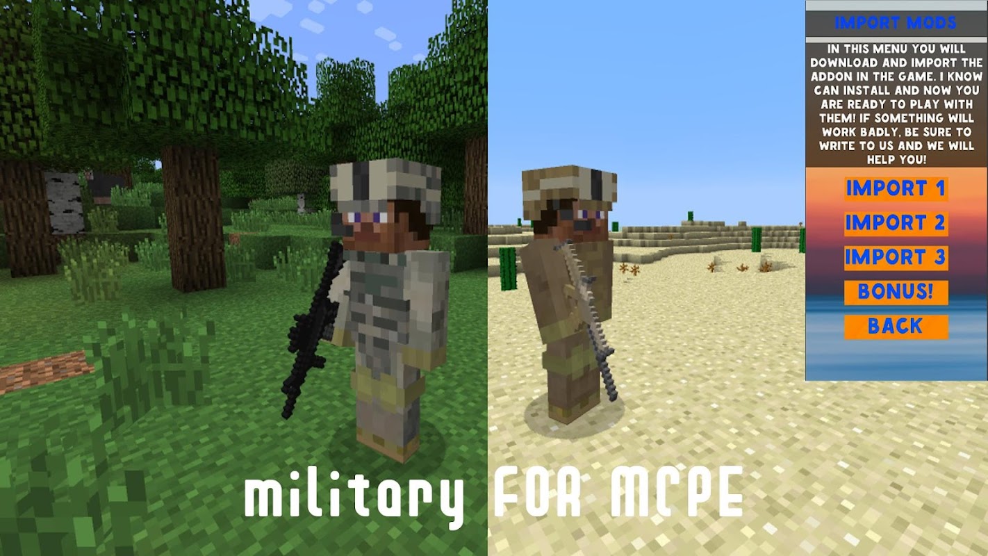 😀If you are tired of the regular version of Minecraft and want to diversify the gameplay, you can install one of our modifications. This is what we talked about above. But this will not be the usual addition that adds fabulous animals, new locations or props, but unique mods. You can download the always updated Military Mod for Minecraft Pocket Edition 2022!🤣😀