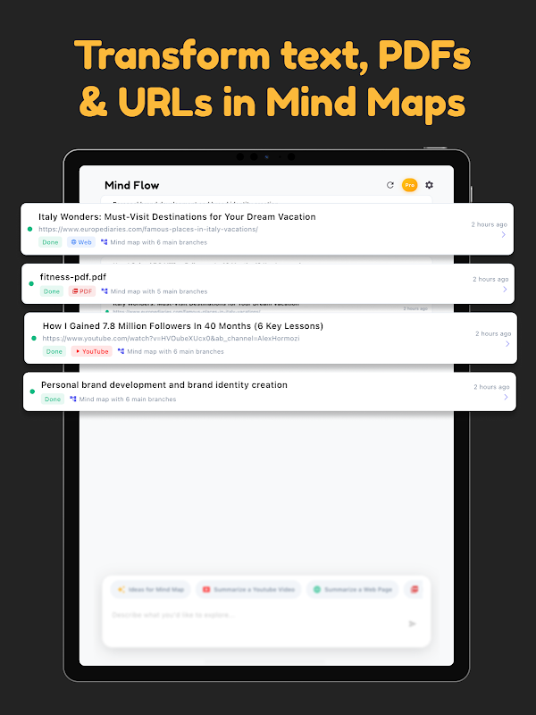 برخلاف ابزارهای سنتی نقشه برداری ذهن، MindFlow از هوش مصنوعی پیشرفته برای استخراج و سازماندهی خودکار اطلاعات از منابع مختلف استفاده می کند. دیگر نیازی به یادداشت برداری دستی نیست - دستیار هوش مصنوعی ما در حالی که روی خلاقیت و بهره وری تمرکز می کنید، کارهای سنگین را انجام می دهد.