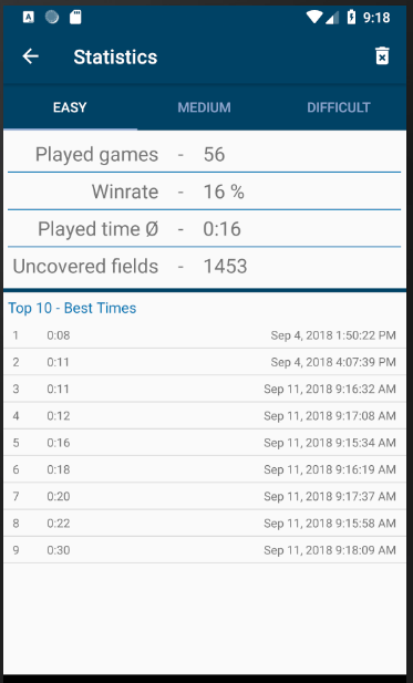 حداکثر 10 بازی را می توان ذخیره کرد و بعداً ادامه داد. عملکرد شما برای سه حالت بازی اصلی جمع آوری و تجزیه و تحلیل شده است و می توانید در صفحه آمار مشاهده کنید. در آنجا می توانید تعداد بازی های انجام شده، نسبت بازی های برنده شده، میانگین زمان برنده شدن mgaes، تعداد فیلدهای آشکار شده و 10 بهترین زمان برای هر حالت بازی را بررسی کنید.