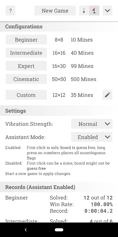 • Presets: Provides 4 different board configurations with varying sizes and mine density.