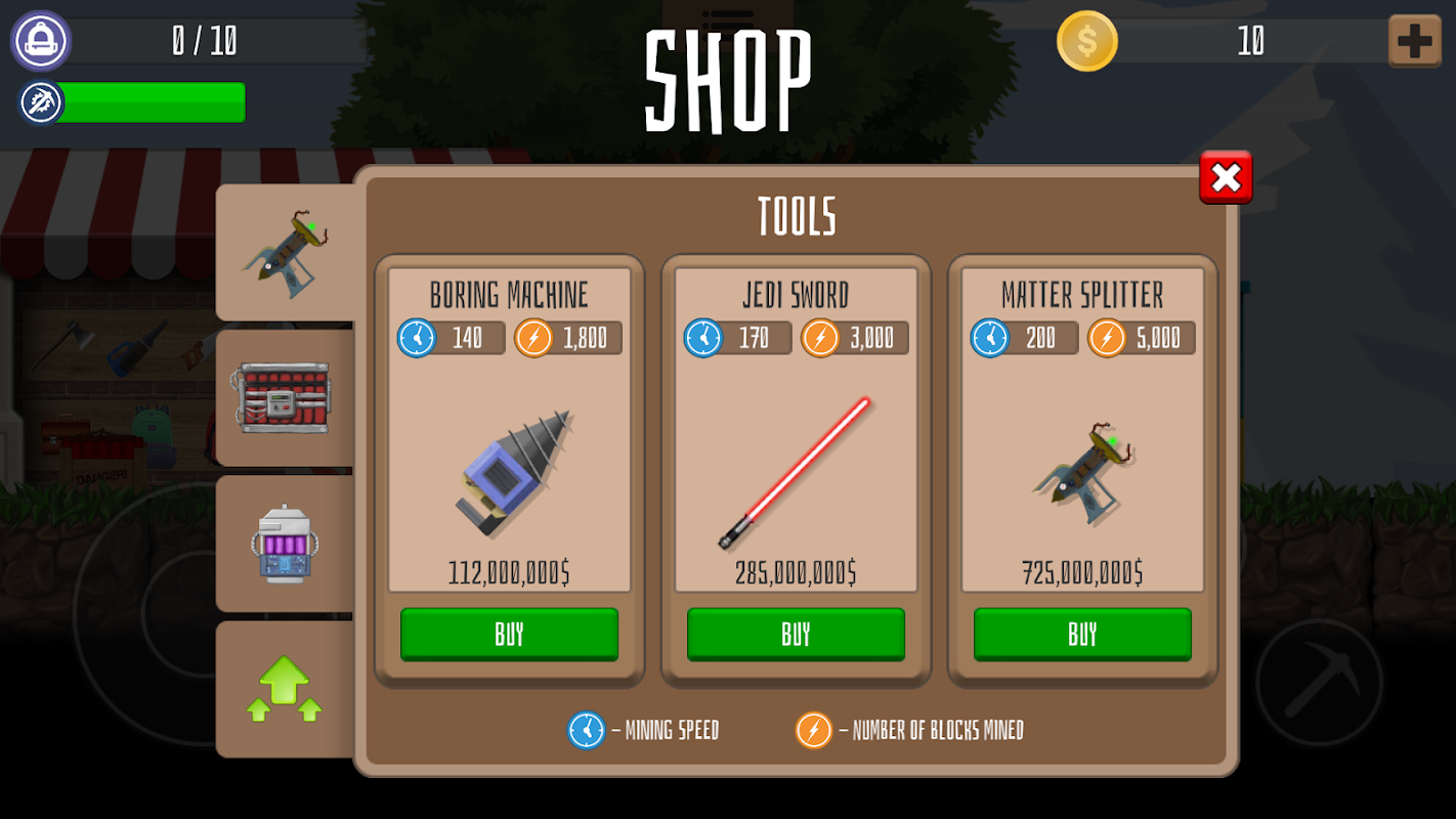 - Buy new tools from 20 different types, such as: pick, vacuum cleaner, guitar, chainsaw, Jedi sword, etc.