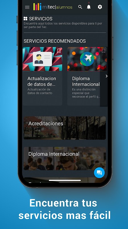 MiTec Móvil te ayudará a mantenerte informado con las últimas noticias del campus, ver videos relacionados a tu vida estudiantil, revisar tus calificaciones, navegar por tu catálogo de cursos en línea. También podrás configurar que servicios quieres ver en tu menú!! ¡Y todo esto en la palma de tu mano!