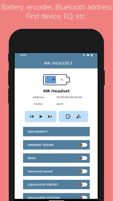 هدست MK میتواند به شما کمک کند هدفونهای بلوتوث، آدرس صفحه نمایش، رمزگذار، سطح باتری، تنظیم صدای محیطی، اکولایزر، جلوههای فراگیر سهبعدی، تنظیم صدا، و حتی ارسال صدا به دستگاهها برای دستیابی به موسیقی، صدا، آهنگهای زنگ با کیفیت بالاتر، یافتن، اتصال و جفت کردن هدفونهای بلوتوث ، صداهای هشدار و غیره