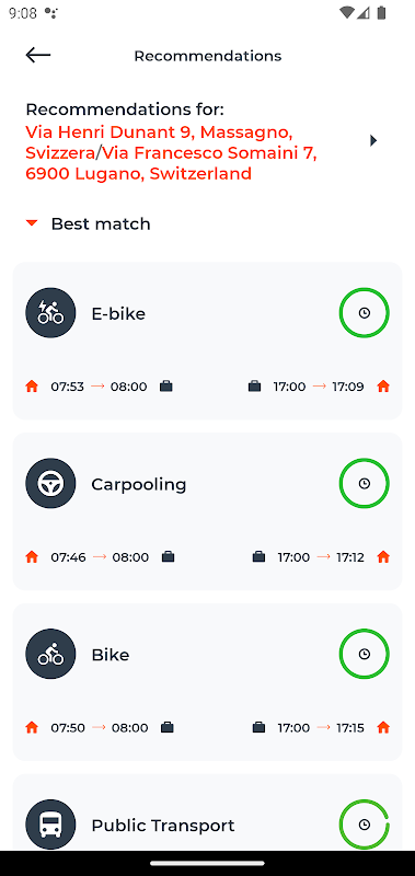 - جستجو برای بهترین گزینه های جابجایی بر اساس پارامترهای کاربر (زمان کار و آدرس خانه-محل کار). حملونقل عمومی، پارک و راهآهن، حملونقل خودرو، شاتلهای (بین) شرکتی و شاتلهای کوچک، دوچرخههای الکترونیکی، وسایل حرکت آهسته، دوچرخه و راهآهن، اشتراک دوچرخه، پیادهروی در نظر گرفته میشوند. گزینه های تحرک به ترتیب مناسب بودن برای مورد خاص، یا به ترتیب تأثیر محیطی، فعالیت فیزیکی انجام شده یا صرفه جویی مالی پیشنهاد می شوند.