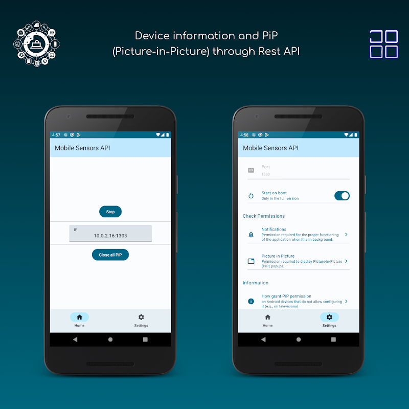 برای تبدیل دستگاههای اندرویدی (تلفن هوشمند، تبلت، تلویزیون) به دستگاههای اینترنت اشیا با استفاده از RestAPI از «API Sensors Mobile» استفاده کنید. شما می توانید اطلاعات را از دستگاه های خود بازیابی کرده و آنها را از راه دور در شبکه WiFi خود کنترل کنید.