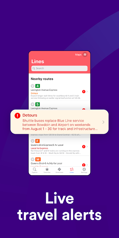 کاربران نیویورک می توانند از نقشه دقیق متروی نیویورک و پوشش جامع حمل و نقل MTA، از زمان اتوبوس MTA تا برنامه قطار MTA لذت ببرند. برای کسانی که به وقتشناسی اهمیت میدهند، هشدارهای برنامه اتوبوس و قطار ما تضمین میکند که هرگز یک سفر را از دست ندهید.
