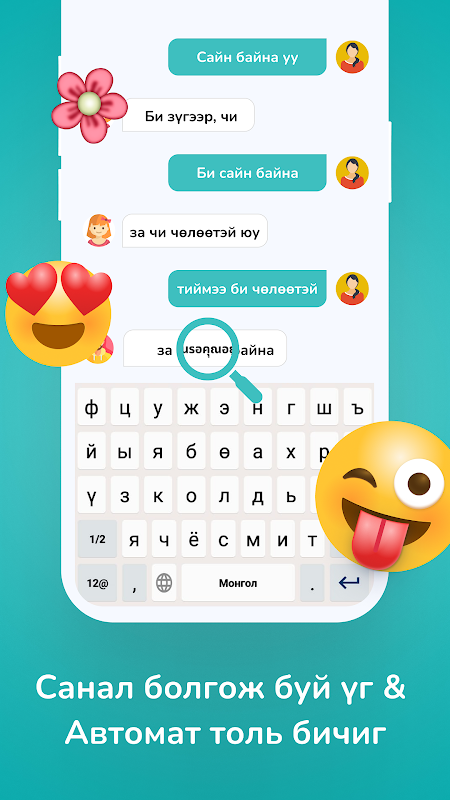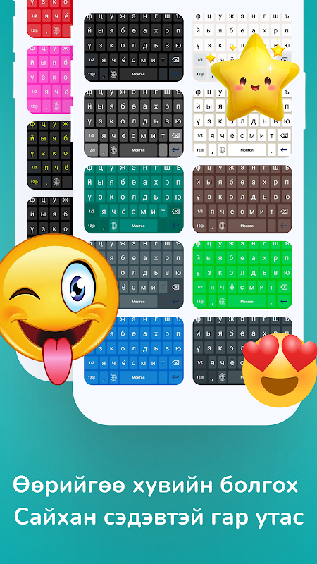 تایپ آسان مغولی جدید با صفحهکلید برنامه Emoji بهویژه برای افرادی طراحی شده است که میخواهند زبان مغولی را از ابتدا همراه با شکلک یاد بگیرند. صفحهکلید مغولی و برنامه صفحهکلید انگلیسی مغولی تایپ صوتی به شما کمک میکند تا از شکلکها در پستهای خود استفاده کنید. می توانید توسط سایت های رسانه های اجتماعی با دوستان خود و سایر افراد به اشتراک بگذارید.