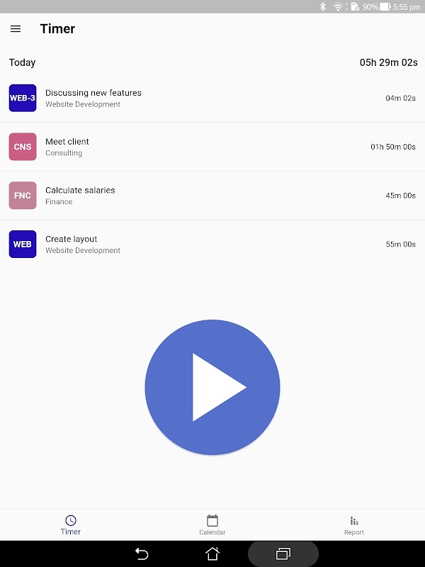 در صفحه تایمر روی دکمه پخش ضربه بزنید و پروژه با کاری که روی آن کار می کنید را انتخاب کنید، به صورت اختیاری عکس ها را اضافه کنید و روی دکمه Clock In ضربه بزنید. کمی زمان را دنبال کنید و روی دکمه مکث ضربه بزنید. زمان شما با حساب شما همگام می شود و در صفحه تقویم و گزارش قابل مشاهده خواهد بود