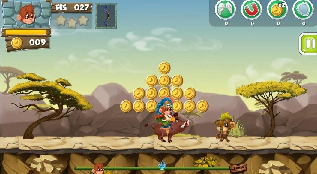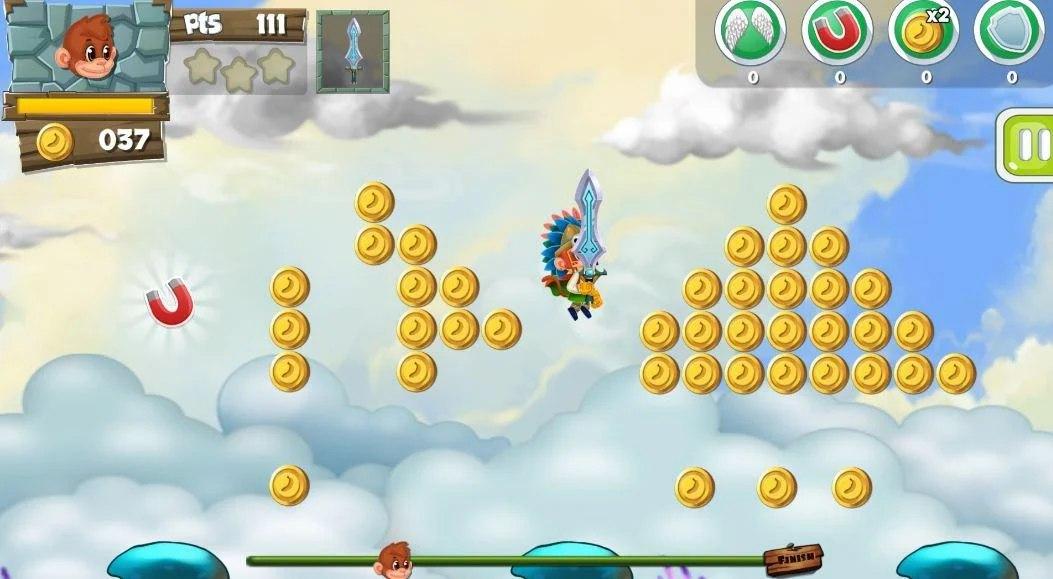 Help the monkey to overcome all difficulties! Collect coins and victorious enemies! And then buy in the store things! Become the strongest and go through all the levels!