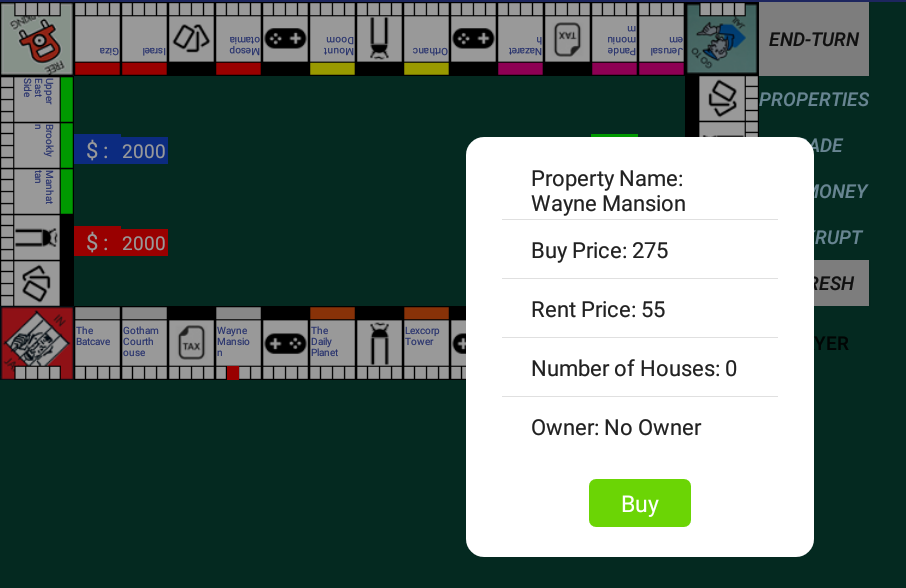 Monopoly is an American board game. The goal of the game is to ruin its competitors by real estate transactions. It symbolizes the apparent and spectacular aspects of capitalism, the fortunes being made and being undone with the roll of the dice. This board game is known worldwide, and there is here the digital version