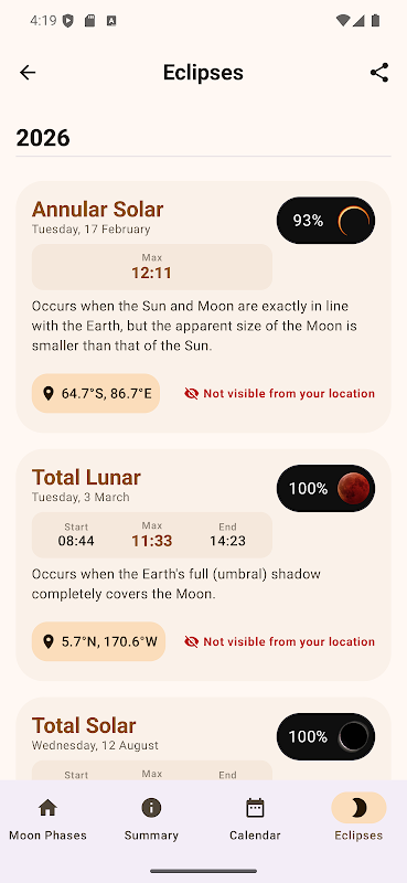 این همچنین شامل یک ماشین حساب قرار گرفتن در معرض برای عکاسی ماه است. این به شما اجازه می دهد سرعت شاتر مورد نیاز بر اساس ISO شما، دیافراگم، شرایط آب و هوایی، مکان ماه و فاز. شما همچنین می توانید برای مشاهده مراحل در طول ماه، از ماه استفاده کنید و به سرعت به آن روز حرکت کنید. این برنامه همچنین شامل برخی از ویدجت های زیبا برای استفاده در صفحه نمایش خود را به طوری که همیشه می توانید فاز ماه را ببینید.