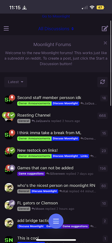 یک چت کوچک سرگرم کننده برای سایت محبوب بازی های Moonlight (https://moonlight.silvereen.net) که در آن می توانید با دوستان و خانواده خود چت کنید. در مورد هر چیزی از جمله تکالیف، بازی ها، یا هر موضوع دیگری که فکرش را بکنید گپ بزنید!