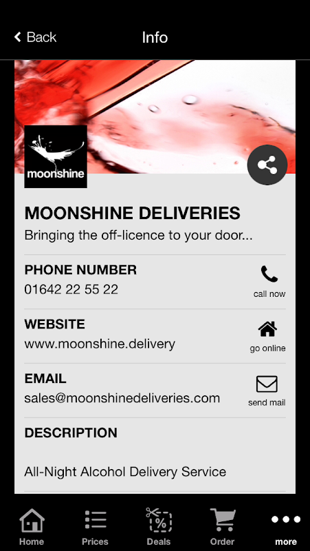 مونشاین، تاسیس در سال 2004، سرویس تحویل الکل همه شب است که در سراسر Teesside (میدلزبورو / استوککتون-روی-تیز)، Redcar & amp؛ کلیولند، دارلینگتون، هارتلپول و آخرین شعبه ما در کامبیرا باز است.