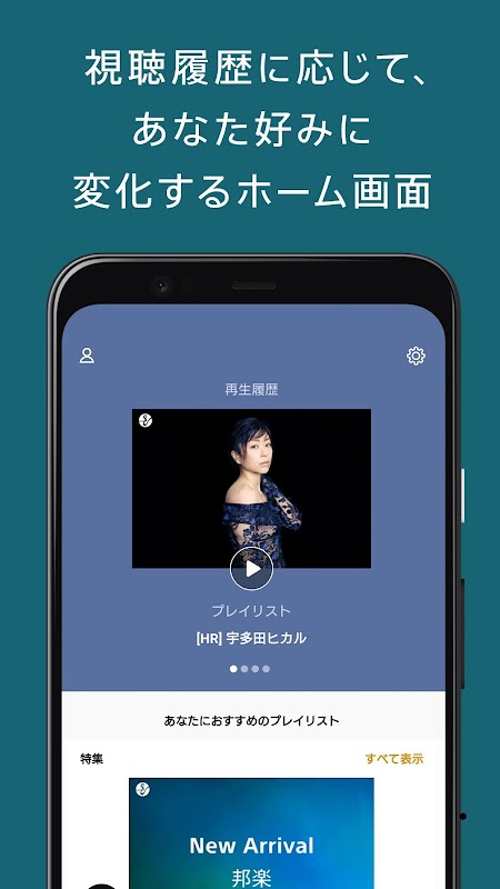 ホーム画面では、視聴履歴に応じ、好みに合わせたおすすめのアイテムを表示します。