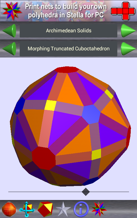 Go ad-free with MoStella Silver or Gold! MoStella Silver adds the remaining 54 non-convex uniform polyhedra and a collection of uniform prisms and antiprisms. MoStella Gold adds hundreds of other polyhedra including Johnson solids, near misses, stellations, compounds, geodesic spheres, Stewart toroids and more.
