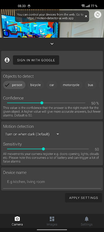 Motion Detector AI یک برنامه ابتکاری دوربین امنیتی خانگی است که از دوربین داخلی تلفن شما برای نظارت بر محیط اطراف شما استفاده می کند. با استفاده از یک الگوریتم پیشرفته هوش مصنوعی، میتواند افراد، حیوانات خانگی، ماشینها و سایر اشیاء را در منطقه شناسایی کند. پس از شناسایی، یک اعلان به گوشی هوشمند دیگری ارسال میکند و به شما امکان میدهد تا از راه دور با دستگاه اندرویدی خود، فضای خود را بررسی کنید. چه به دنبال مراقبت از حیوان خانگی خود باشید، از کسب و کار یا دفتر خود محافظت کنید یا به سادگی خانه خود را ایمن کنید، Motion Detector AI راه حل عالی است.