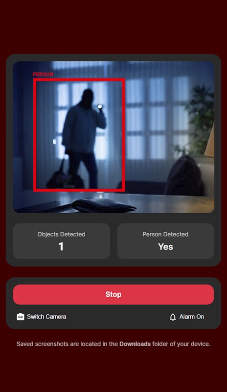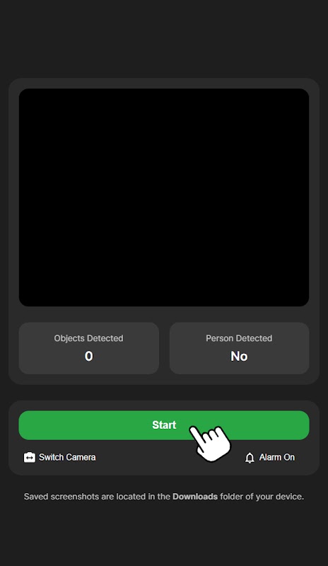 2. Start Detection: برای شروع تشخیص حرکت، روی «شروع» ضربه بزنید. فید دوربین روی صفحه نمایش داده می شود و برنامه اشیا و افراد را کنترل می کند.