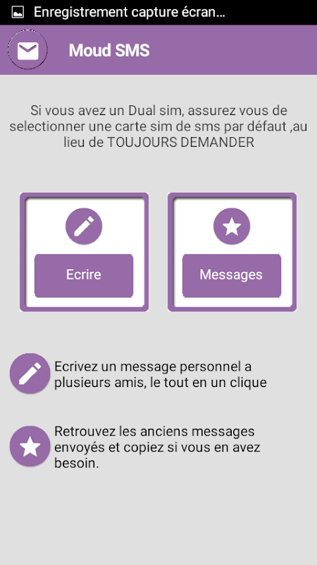 Moud SMS est une application de message qui vous permet d'envoyer un unique message à un groupe d'amis avec chacun son nom à l'intérieur. Par exemple vous voulez écrire BONJOUR à trois amis: Henri, Olivier, et Alex. Avec Moud SMS vous pourrez envoyer en un clique: Bonjour Henri, Bonjour Olivier, Bonjour Alex. Il suffit d'écrire Bonjour, d'appuyer le bouton PLUS et Moud SMS fait le reste.