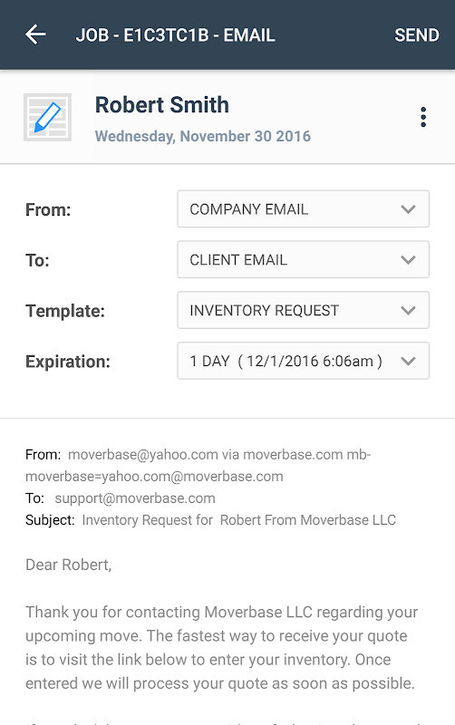 • مشتری سابقه کار: تمام گذشته جابز و برآوردها، چه تکمیل یا نه، می توان ذخیره و در Moverbase جستجو.