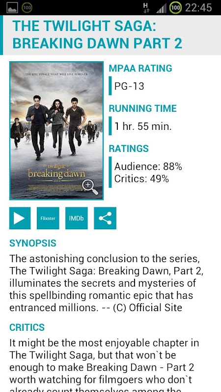 Get MovPlex and you will never missed your favorite movies playing. MovPlex is Indonesian-Based-Cinema movie schedule. MovPlex use the data from the largest Cinema Group (Studio 21 & Studio XXI) and Blitzmegaplex in Indonesia. MovPlex now connected to Rotten Tomatoes API for Box Office Movies (Opening, Top & Upcoming). MovPlex has a very attractive design and is very easy to use.