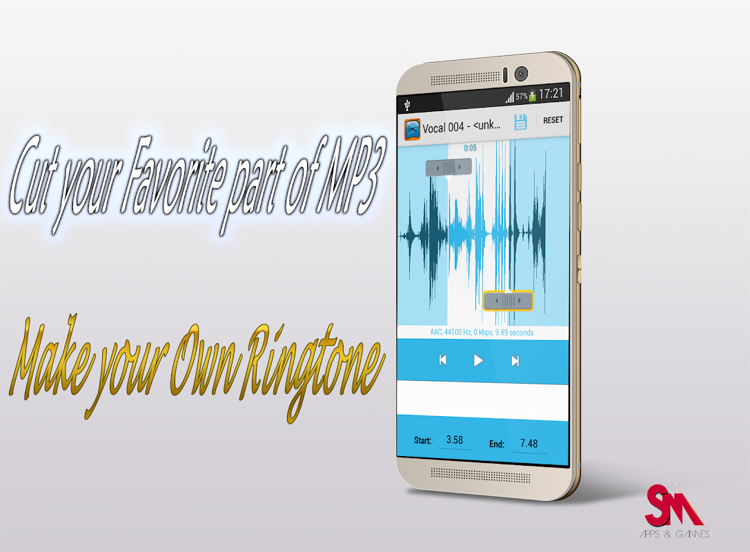 MP3 Cutter and Ringtone Maker is free app creates ringtones, alarms, and notifications from MP3, WAV,AAC/MP4, 3GPP/AMR files,myxer ringtones, You can set the start and ending notes by sliding arrows along the timeline.