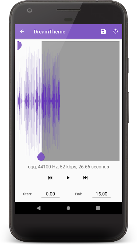Mp3 Cutter / Ringtone Maker نرم افزار رایگان ایجاد آهنگ زنگ، آلارم، و اطلاعیه ها از تمام فایل های صوتی مانند MP3، M4a و غیره. شما می توانید شروع و پایان یادداشت را با کشیدن فلش در طول جدول زمانی، با فشار دادن شروع و پایان برای ضبط نقطه، و یا با تایپ کردن در تمبر زمان.