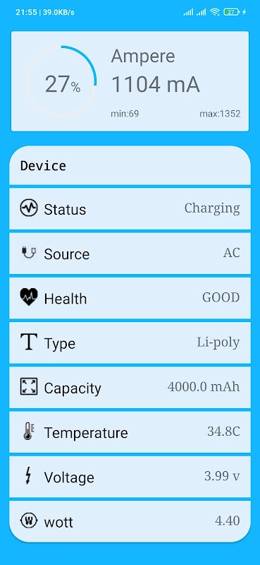 برنامه ای که با اندازه گیری آمپر ، شدت خلبان ، وات و دمای باتری می توانید از وضعیت باتری و دستگاه شارژ آن مطلع شوید. این برنامه اطلاعاتی در مورد باتری مانند ظرفیت و نوع باتری ارائه می دهد. استفاده شده