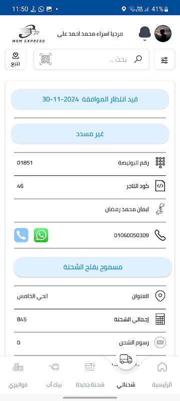 از طریق رابط مشتری، از طریق برنامه، او می تواند محموله ها را اضافه کند، محموله های خود، وضعیت آنها، برنامه سفر حمل و نقل و مانده ها و حساب های خود را پیگیری کند.
