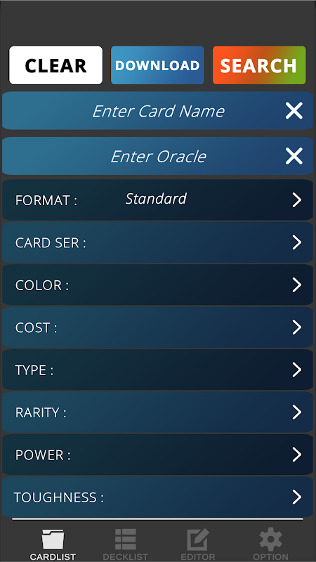 - جستجوی آسان کارت با توجه به پارامترهای اساسی مانند نام کارت ، اوراکل ، قالب ، مجموعه کارت ، رنگ ، هزینه مانا ، نوع ، نادر بودن ، قدرت و چقرمگی
