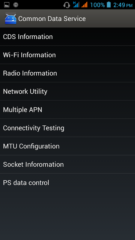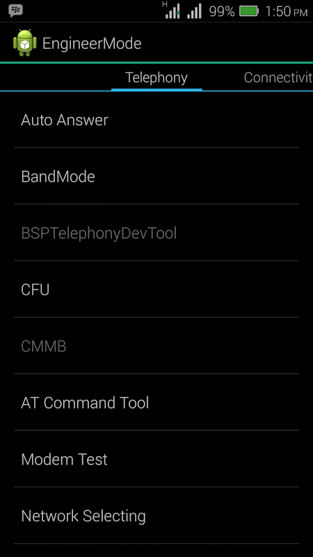 * USB، OTG، سنسور، ویدئو، تنظیمات مکان، ورود به سیستم باتری، mtklogger، صفحه نمایش لمسی، سوئیچ UART / USB، حالت باند، تست آنتن، در ابزار دستور، AMR - WB روشن / خاموش. و غیره