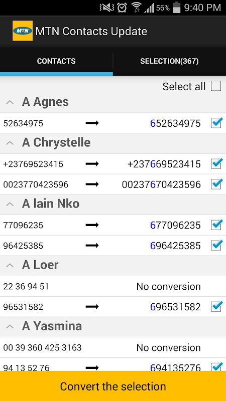 Once the installation of "MTN Contacts Update" is complete, simply launch the application and follow the instructions. The application will then automatically detect Cameroon numbers in your directory that must be changed and displays in real time the prefix that will be added to each number. You then have the choice to ignore some numbers and it remains only you press the "Convert Selection" button, your book is now converted!