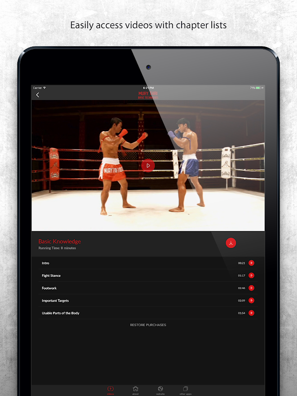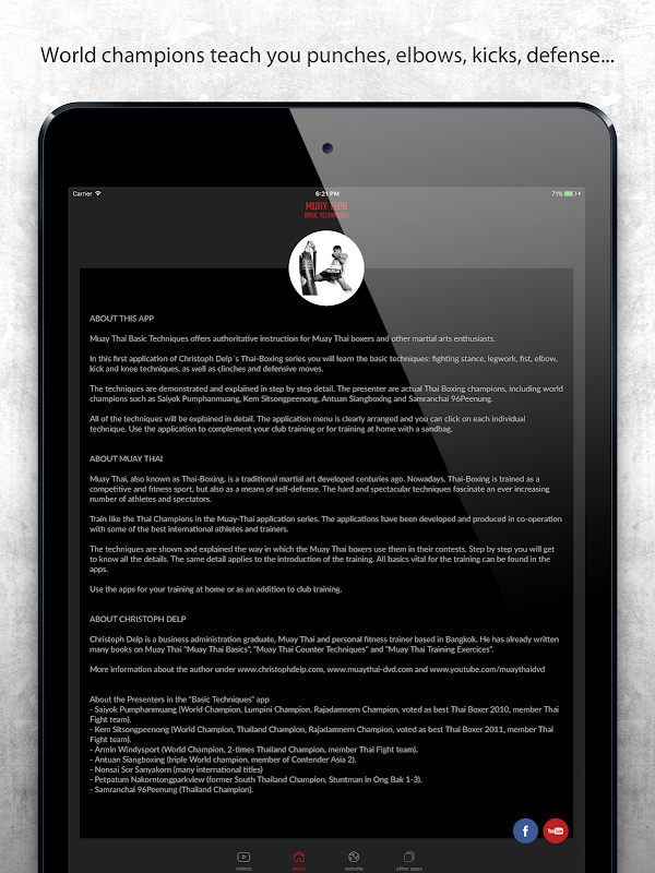 Train like the Thai Champions in the Muay-Thai application series. The applications have been developed and produced in co-operation with some of the best international athletes and trainers.