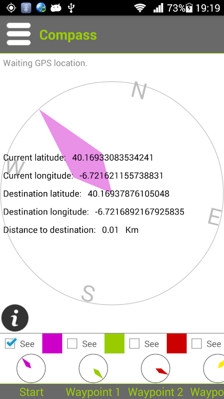 The Compass screen, you will see several compasses pointing in the locations you entered and you can also select it as the primary compass to get more information such as distance to the target, the target coordinates, current coordinates.
