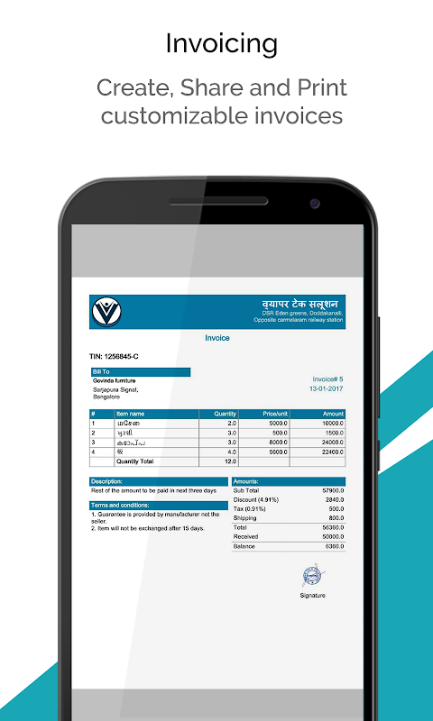 This App has to be coupled with the Vyapar - Accounting App to generate and print bills in your preferred local languages - Kannada, Hindi, Telugu, Tamil, Malayalam, Gujrati etc in any given invoice templates. Just change your keyboard language and type the required details in your bill.