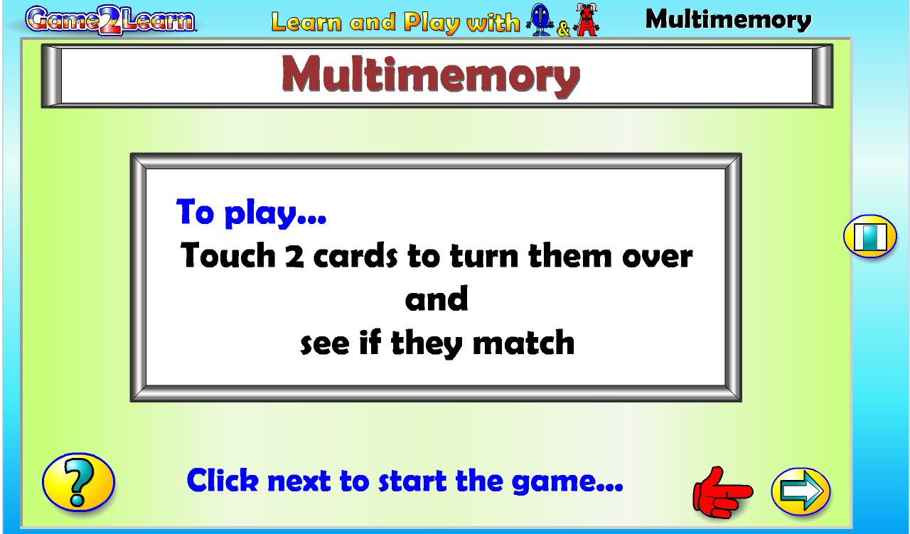 Multimemory with Q&A is designed to help children develop their memory and visual discrimination skills. The added bonus of this game is that it familiarises children with numerals, subitisation and number words.